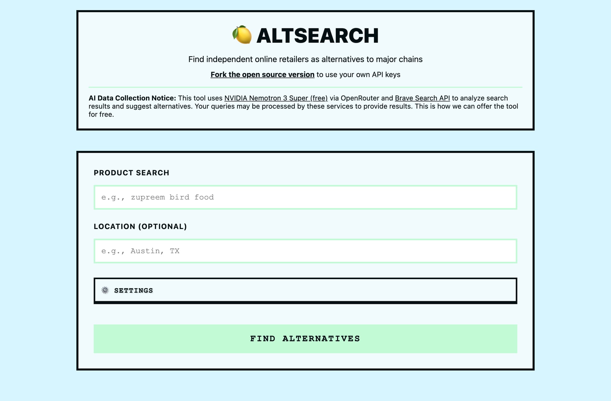 Altsearch is simple. You type in what you're looking for, it uses AI to search the web, filters out the major chains, and returns small businesses that sell it online.